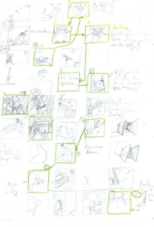 Ich wollte mich nicht damit zufrieden geben, wie das Projekt im Vorkurs der ZHdK ausgegangen ist. Während der Projektlaufzeit hatte ich bereits die Geschichte nieder geschrieben, die eine Dozentin dann auf ihre Bildtauglichkeit Korrektur gelesen hat. Etwa einen Monat lang habe ich am Storyboard gezeichnet (natürlich nicht jeden Tag von morgens bis abends). Ein Viertel des Storyboards fehlt noch, aber ich wollte jetzt mal endlich ein Ergebnis sehen, statt die ganze Zeit nur mit dem Bleistift Miniatur-Bildchen zu malen.