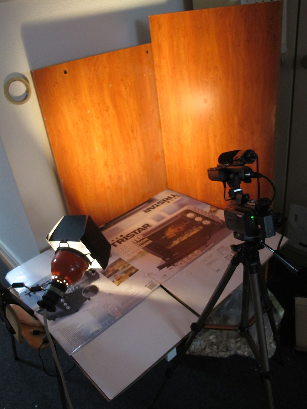 Das eine Bild zeigt mein Filmstudio, bestehend aus einem Tisch und - noch einem Tisch. Genauer gesagt die Seitenwand und die Tischplatte meines alten Schreibtisches, dessen Reste schon vor Jahren im Sperrmüll gelandet sind (möge er in Frieden ruhen). An dem Scheinwerfer kann man sich übrigens Brandblasen holen, wenn er eine Weile eingeschaltet ist. Dafür steht auch dem nächtlichen Arbeiten nichts mehr im Wege und dank der Helligkeit dürfte sich auch der Biorhythmus lagsam auf Nachtschicht einstellen...