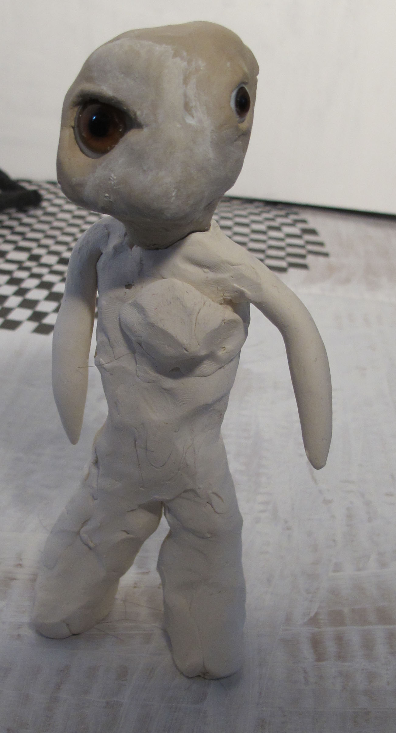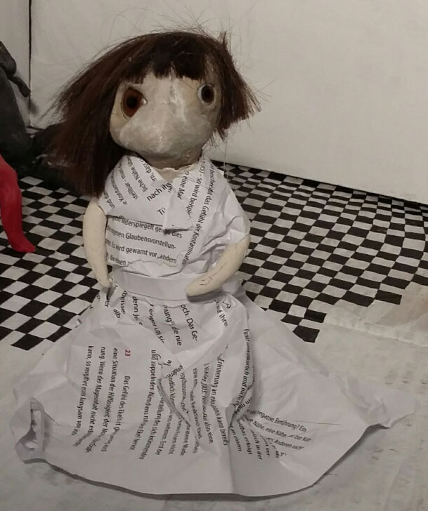 Die Puppe wird im Film wohl keinen Auftritt bekommen - worüber sie bereits ihre tiefste Enttäuschung geäussert hat. Deshalb habe ich ihr versprochen, dass ich ihr Foto zumindest auf dem Blog posten werde, auf dass sie von berühmten RegisseurInnen als Schauspielerin entdeckt werde. Ihr Name ist Lisa. Sie trägt eine Perrücke aus Echthaar. Mir wurde von einer Mitstudentin unterstellt, ich hätte mir dafür extra die eigenen Haare abgeschnitten. Das stimmt jedoch nur bedingt - mein ehemaliger Pferdeschwanz war einige Monate hier eingelagert, bevor ich jetzt Teile davon benutzt habe. Lisa hat übrigens ein besonderes Kleid verpasst bekommen - die Fehlausdrucke meiner schriftlichen Bachelor-Arbeit.