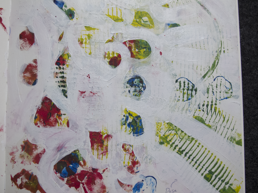 Kürzlich ist mir das Buch "Stamp Lab" (Amazon Link) in die Hände gefallen. Die Autorin druckt wirklich mit allem. Flipflos, Hosenknöpfen, Radiergummis... Das vorliegende Bild beinhaltet drei Drucktechniken. Die gerippten Abdrücke stammen von einer normale Lebensmittel-Dose (ohne das Papier drumherum). Die rundlichen Abdrücke sind von einem bereits gekauten, flasch gequetschten Kaugummi. Und diese körnigen Abdrücke sind von einem Stück Stoff (die liebe ich am meisten). Um etwas Komplexität zu reduzieren habe ich mit weisser Farbe gewisse Bereiche abgedeckt. Das Experiment hat riesigen Spass gemacht. Man fühlt sich plötzlich wieder wie als Kind, als alles als Spielzeug dienen konnte. Plötzlich entdeckt man immer mehr Sachen, mit denen man auch Drucke machen könnte.