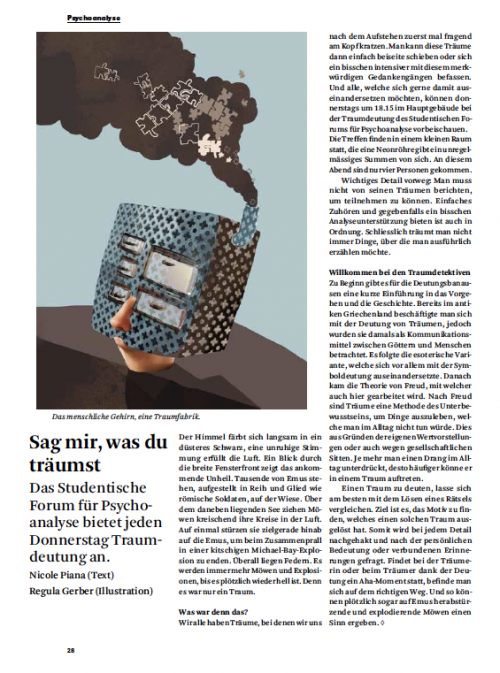 Die Zürcher Studierendenzeitung hat gerade eine Illustration von mir zum Thema Traumanalyse veröffentlicht. Meine erste veröffentlichte und gedruckte Illustration.