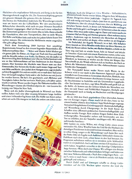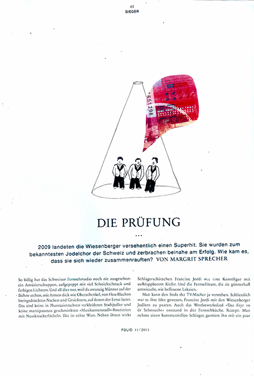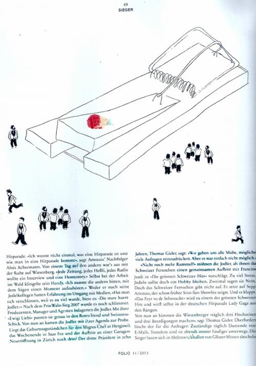 Vielleicht nochmals kurz der Projektbeschrieb, da ich manchmal etwas chaotisch schreibe: wir sollten den Artikel über die Wiesenberger der 2013 in NZZ Folio erschienen ist, illustrieren und auch selbst layouten. Dabei war die Vorgabe: 3 bis 5 Bilder. Wir beschäftigten uns zunächst mit Illustrationen zu Zeitungsartikeln, wo wir ein Gespür dafür bekamen, wie Illustrationen mit einem Artikel funktionieren, welche gut und welche weniger gut funktionieren und warum. Damit hatten wir die Theorie. Das in der Praxis dann umzusetzen, war weitaus schwieriger. Die letzte Seite fehlt übrigens - da war nur noch Text drauf.